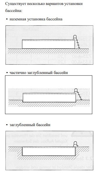 Место под бассейн должно быть ровным и утрамбованным. Насыпную или рыхлую землю необходимо хорошо утрамбовать, чтобы бассейн со временем не погружался.Удалите из котлована все предметы, которые могут нанести повреждения внешней облицовке бассейна. При установке на асфальт или бетон необходимо избегать соприкосновения стенок бассейна с асфальтовым (бетонным) покрытием. В этих целях мы предлагаем использовать защитные планки или изоляционный материал. Запрещатеся размещать котлован в заведомо влажной, зыбко-водянистой почве, в местах скопления грунтовых вод! Для большего спокойствия отсутствия данного факта желательно установить дренаж! Земля в области котлована должна соответствовать статическим требованиям. Не устанавливайте бассейн непосредственно на траву, щебень, рубероид, асфальт, дерево или землю, которую обрабатывали какими-либо хим. средствами или подкормкой для растений — они могут повредить пленочное покрытие из ПВХ. Исходя из статических причин бассейн 1,5м. глубиной необходимо углубить мин. на 50см! Нет необходимости демонтировать бассейн на зиму и/или сливать воду. Зимние температуры не причинят вреда ни бассейну, ни пленочному покрытию. Вода перенимает температуру из окружающей среды: незаглубленный бассейн — воздуха, заглубленный бассейн — земли (единственный минус, - что весной потребуется больше временя для прогрева воды бассейна). Для более стабильной и долгосрочной службы бассейна настоятельно рекомендуем перед установкой подготовить донную бетонную плиту (подушку) 15-20cm толщины и выступающую на 20 см по окружности бассейна. Плиту желательно армировать. Пожалуйста, посоветуйтесь относительно этого вопроса со специалистом. Идеальное местоположение для Вашего бассейна под солнцем и одновременно в защищенном от ветра и листвы месте. Решение относительно наземной установки или частичного / полного заглубления бассейна: Если Ваш бассейн глубиной 1,2м, то для вас будет вполне подходящим выбор в пользу наземной установки бассейна. Для большей уверенности Вы можете его, как и бассейны 1,5м глубиной, углубить частично или полностью в землю. В этом случае обязательна по внешней окружности бассейна цементно-песочная присыпка смесью!